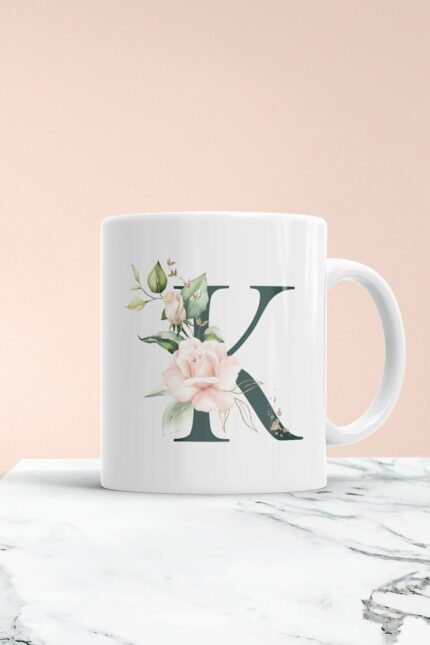 K Harfi Baskılı Çiçek Desenli Dekoratif – Baş Harf Baskılı Kupa Bardak