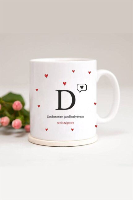 Kalp Detaylı D Harfli Baskılı Kupa Bardak