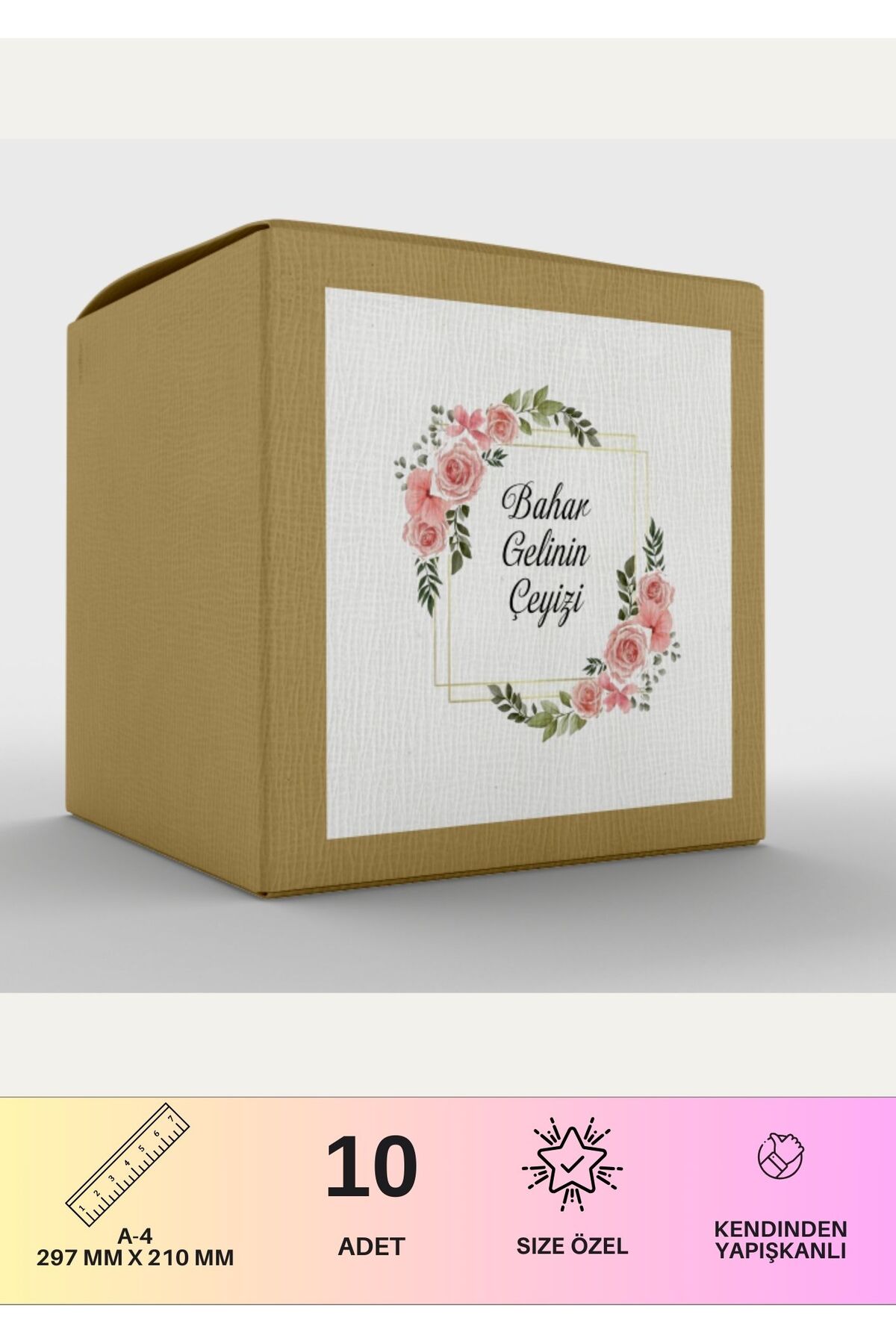 Çeyiz kutularınıza zarafet ve kişisellik katmanın en kolay yolu, özel tasarım a4 boyutunda kendinden yapışkanlı etiketlerimizle tanışın! Çeyiz kutularınızın hem şık hem de düzenli görünmesini sağlayacak bu etiketler, kolay kullanım ve dayanıklılığıyla da öne çıkıyor.;
