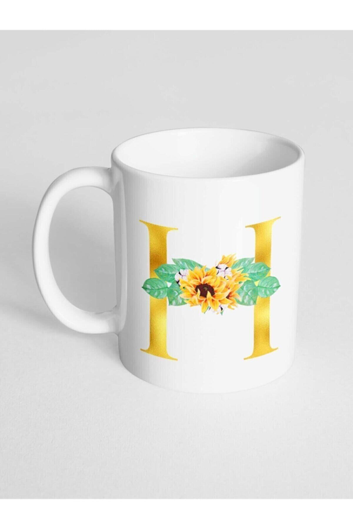 H Harfi Baskılı Çiçek Desenli Dekoratif Baş Harf Baskılı Kupa Bardak