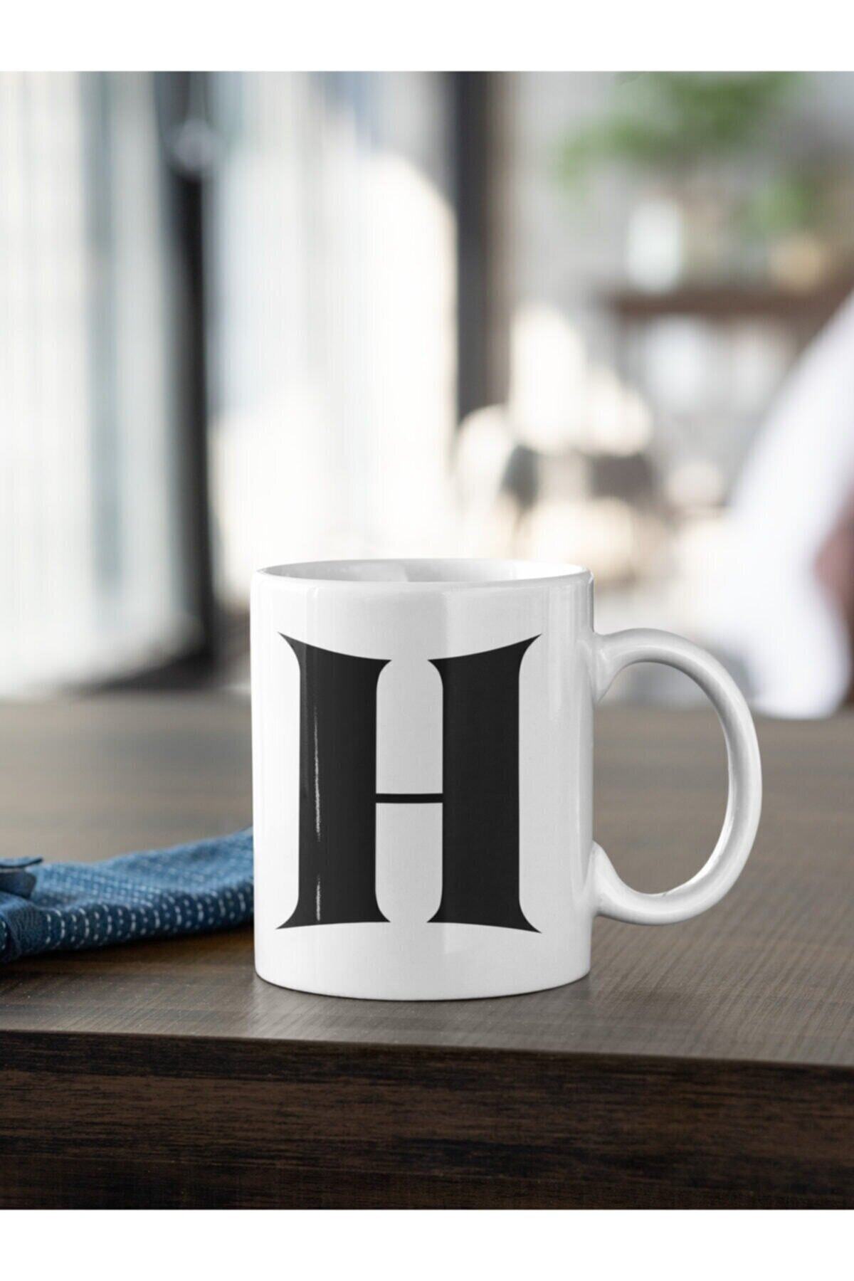 H Harfi Siyah Baskılı Kupa Beyaz Porselen