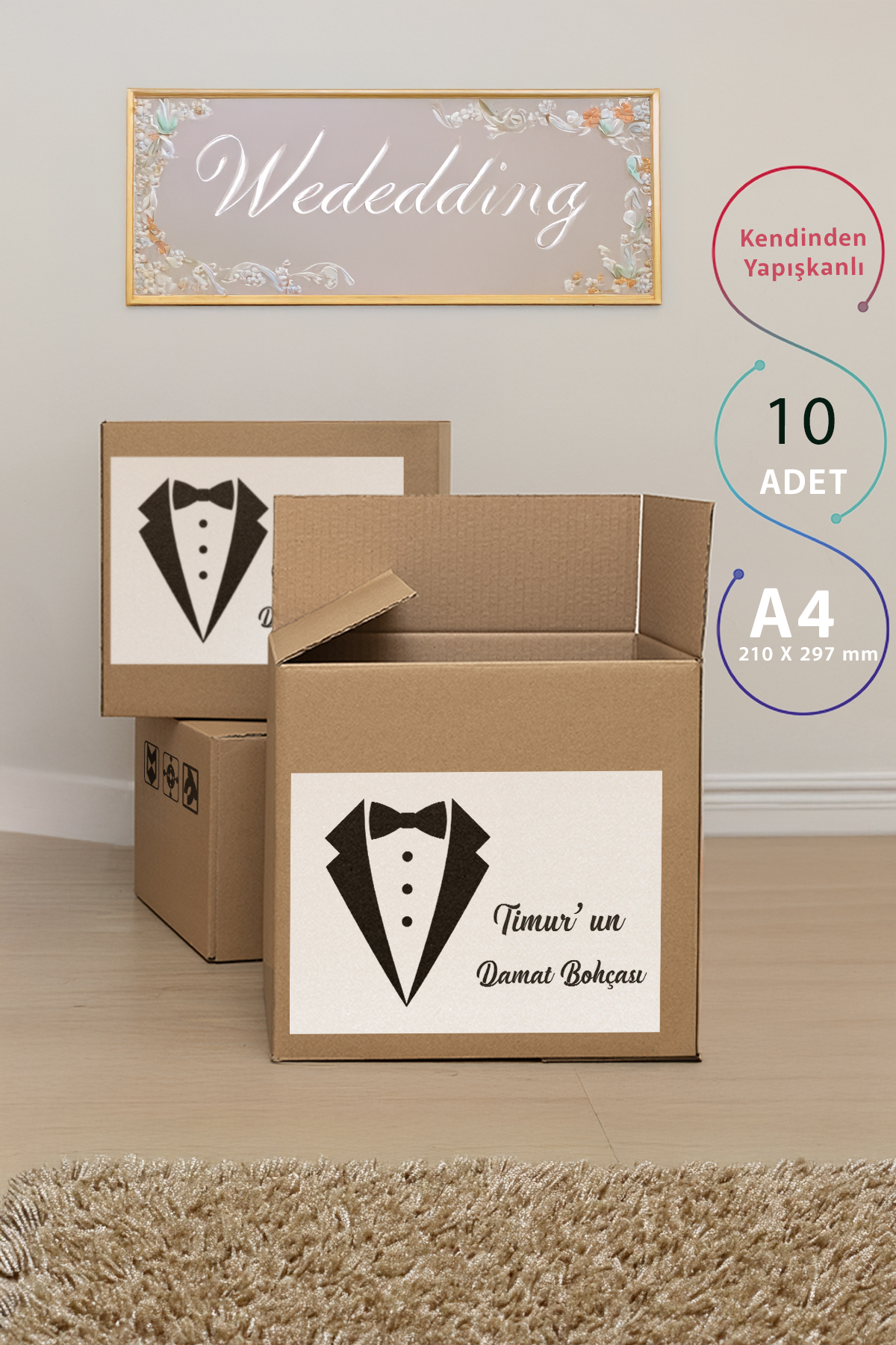 İsme Özel Damat Bohçası Etiketi – 10’lu A4 Paket – Kendinden Yapışkanlı Çeyiz Kolisi Sticker