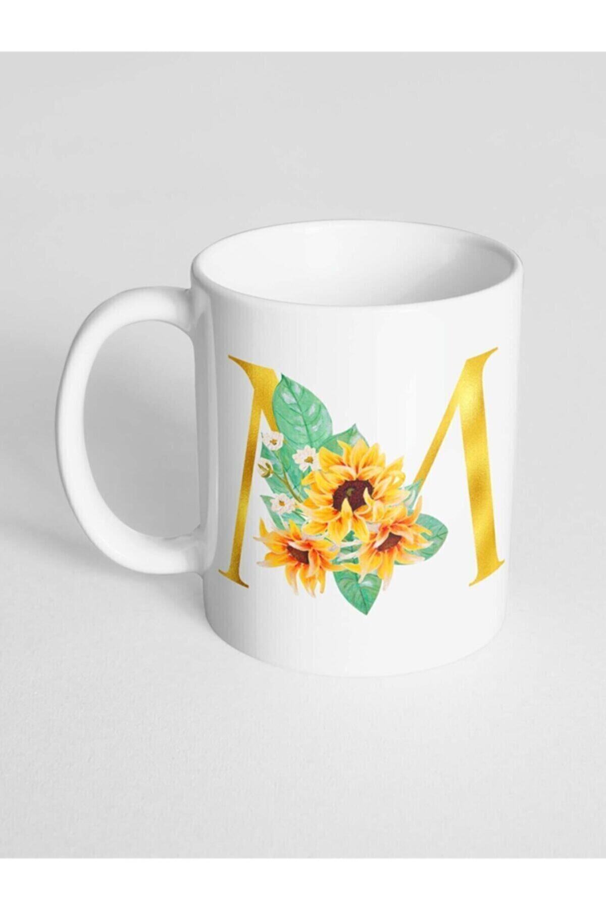 M Harfi Baskılı Çiçek Desenli Dekoratif – Baş Harf Baskılı Kupa Bardak
