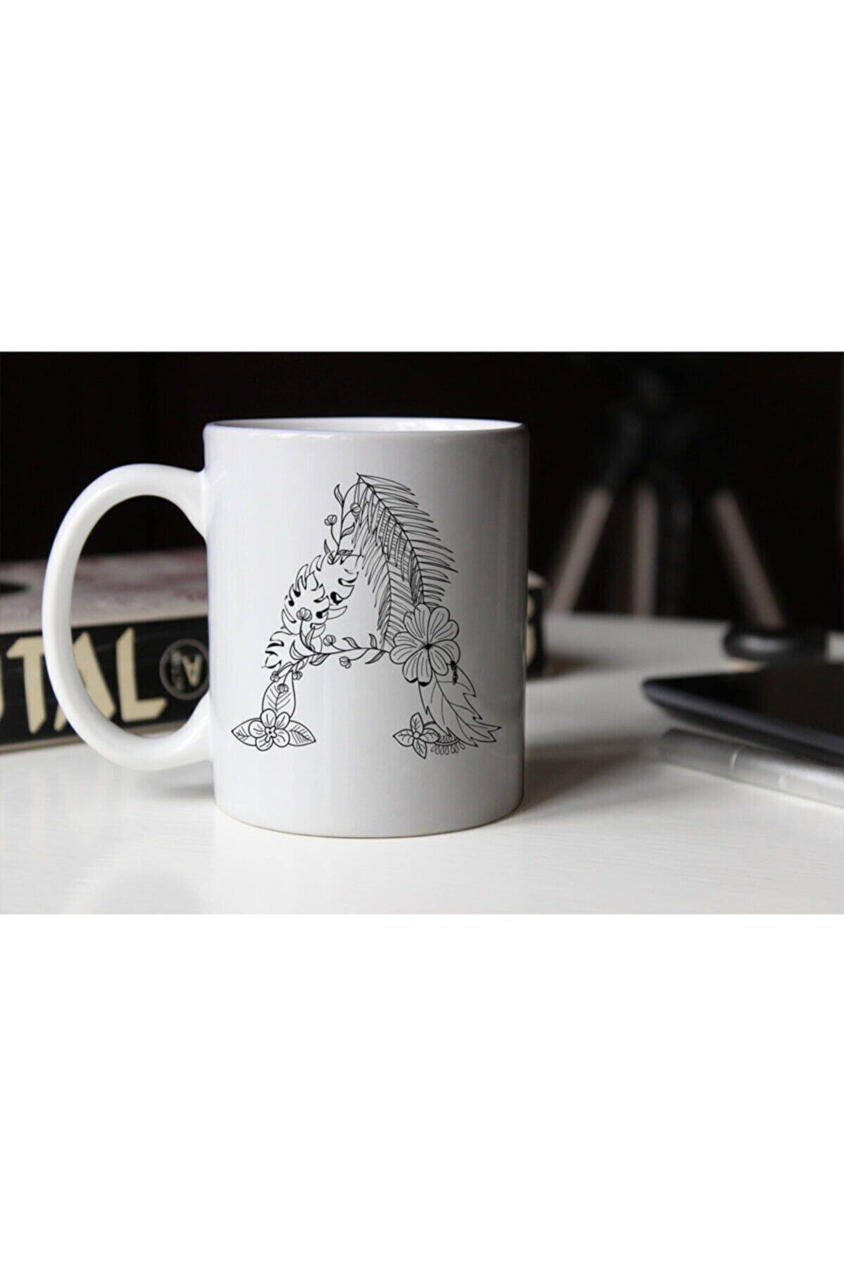 Özel Tasarım Siyah-beyaz Çiçekli A Harfi Baskılı Porselen Kupa Tfs