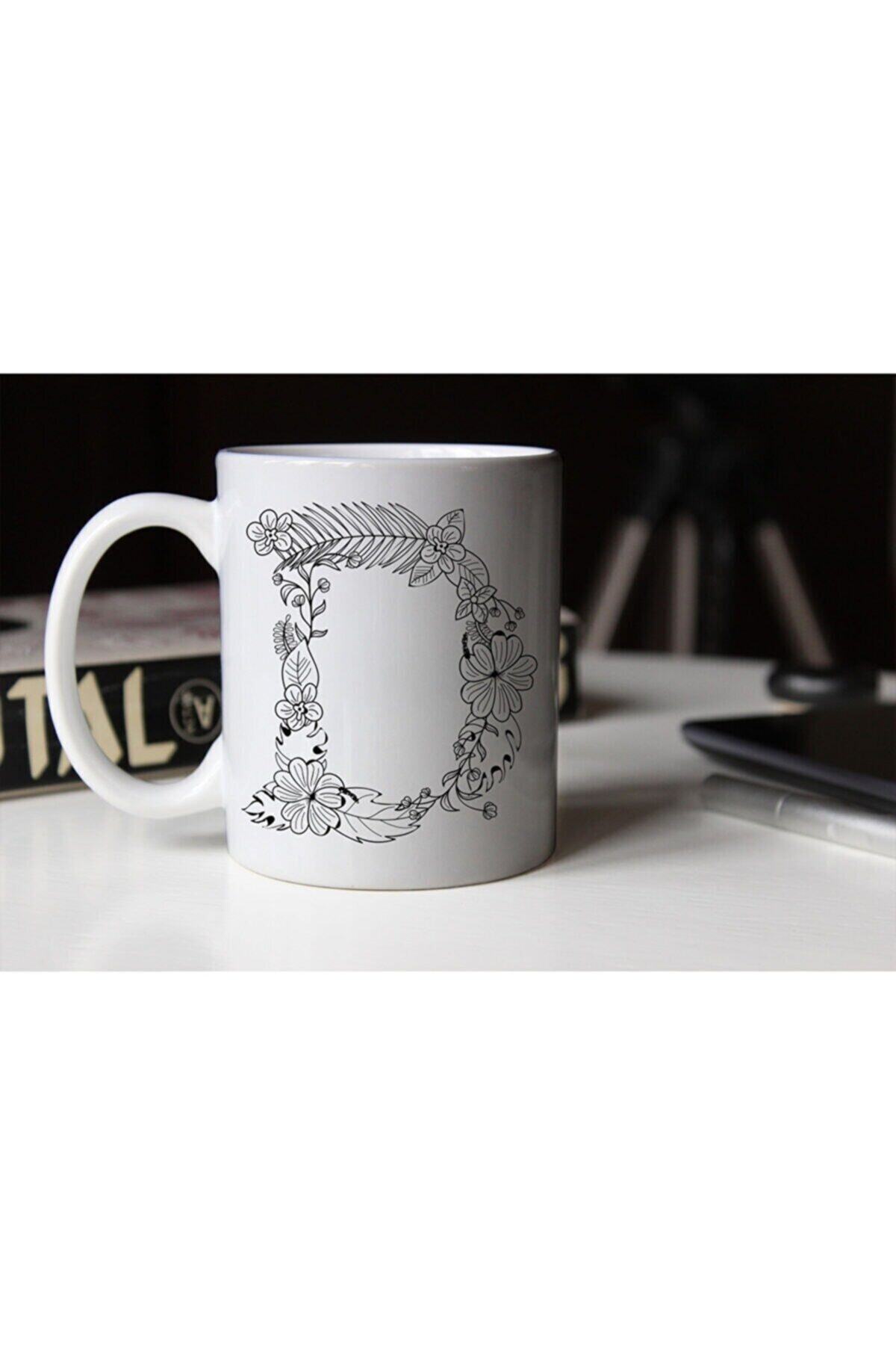 Özel Tasarım Siyah-beyaz Çiçekli D Harfi Baskılı Porselen Kupa Tfs