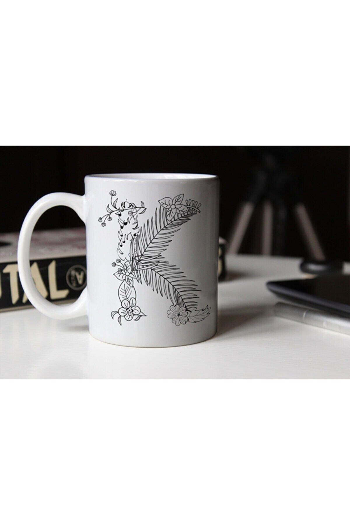 Özel Tasarım Siyah Beyaz Çiçekli K Harfi Baskılı Porselen Kupa Tfs