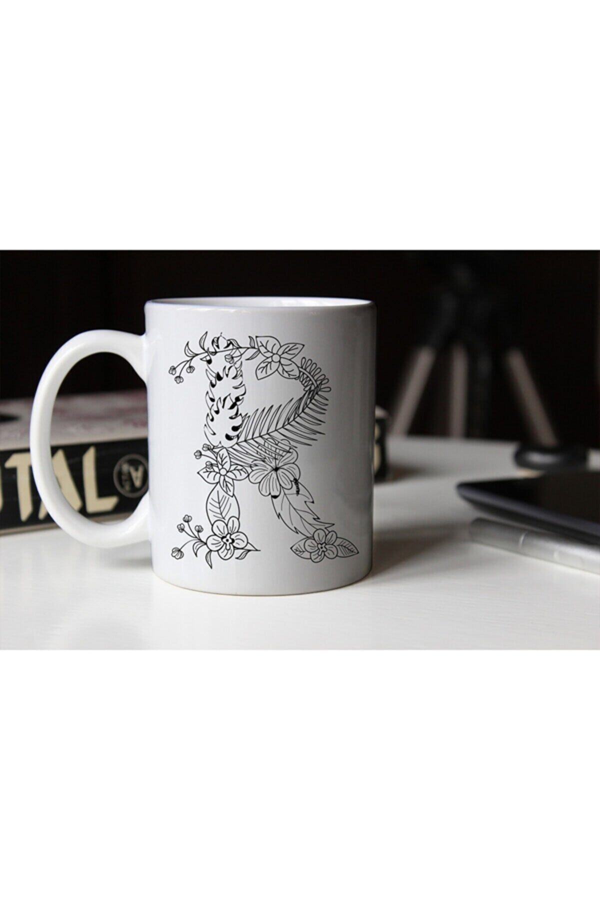 Özel Tasarım Siyah Beyaz Çiçekli R Harfi Baskılı Porselen Kupa Tfs