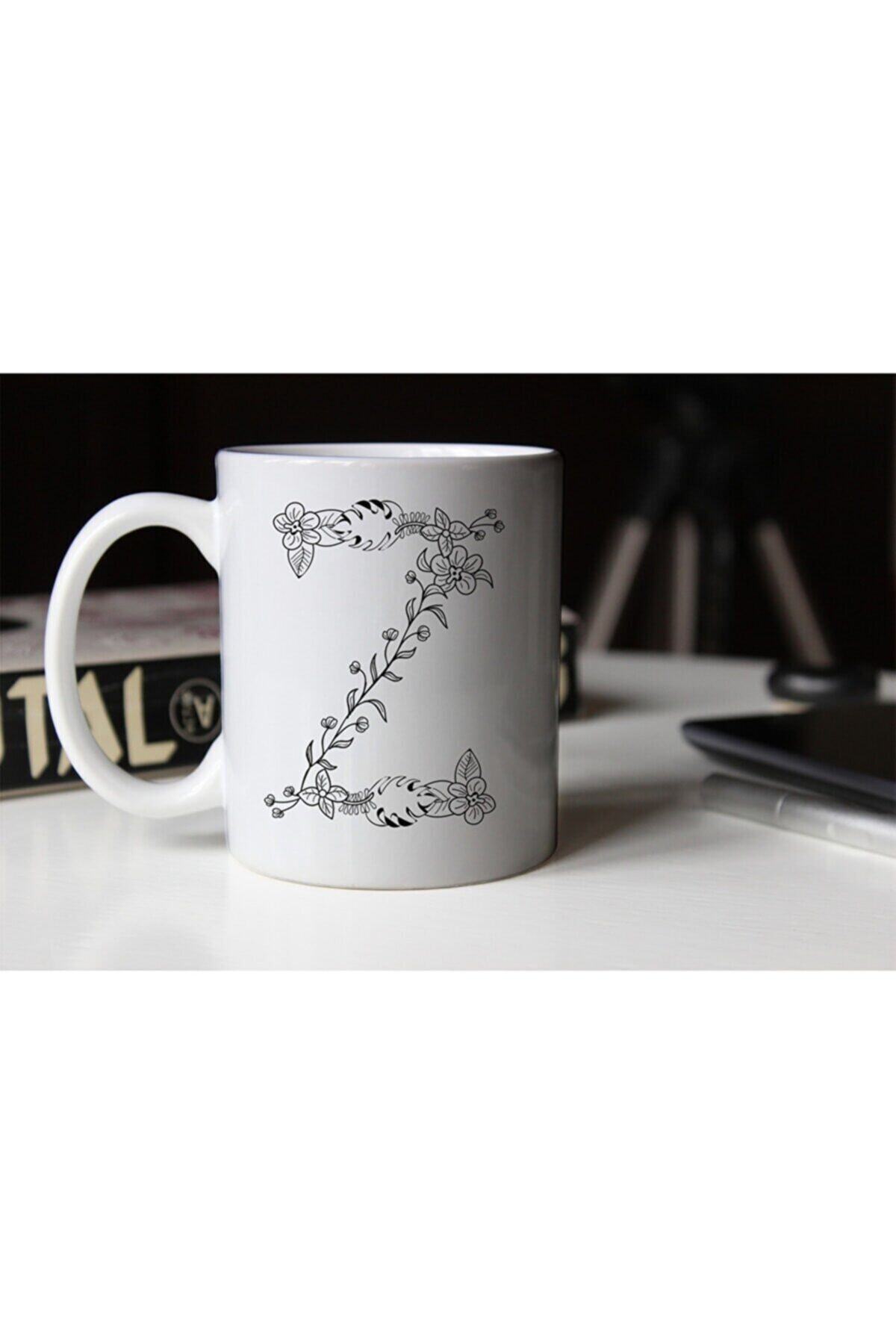 Özel Tasarım Siyah-beyaz Çiçekli Z Harfi Baskılı Porselen Kupa Tfs