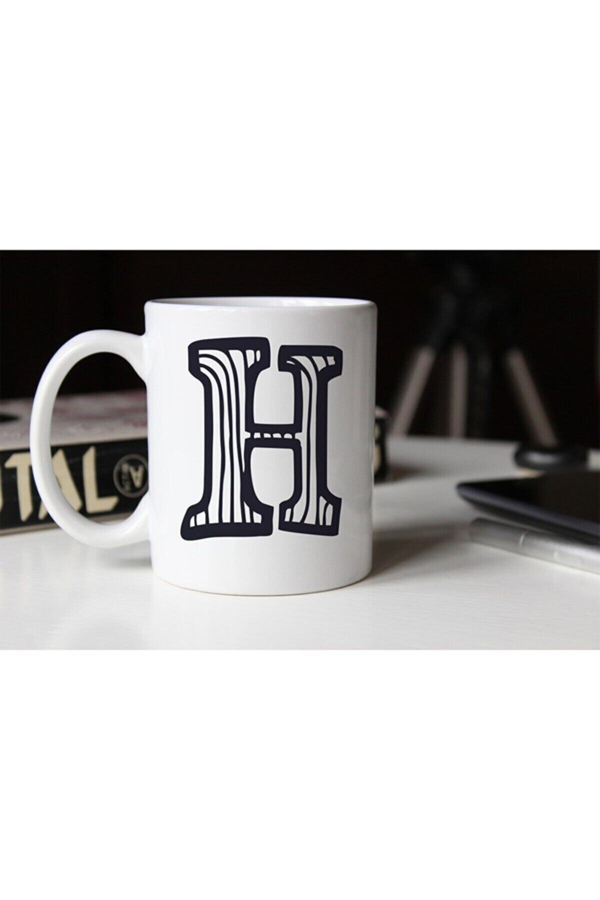 Siyah Beyaz Çizgili H Harfli Porselen Kupa Tfsbh-009