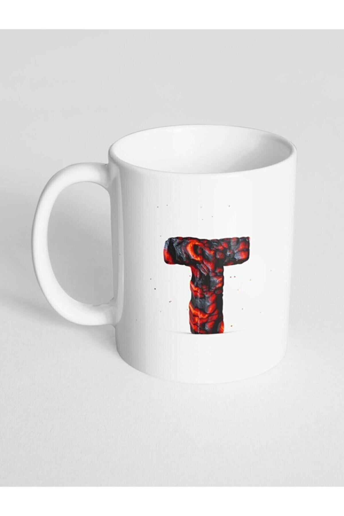 T Harfi Baskılı Kor Alevli Desenli Dekoratif – Baş Harf Baskılı Kupa Bardak