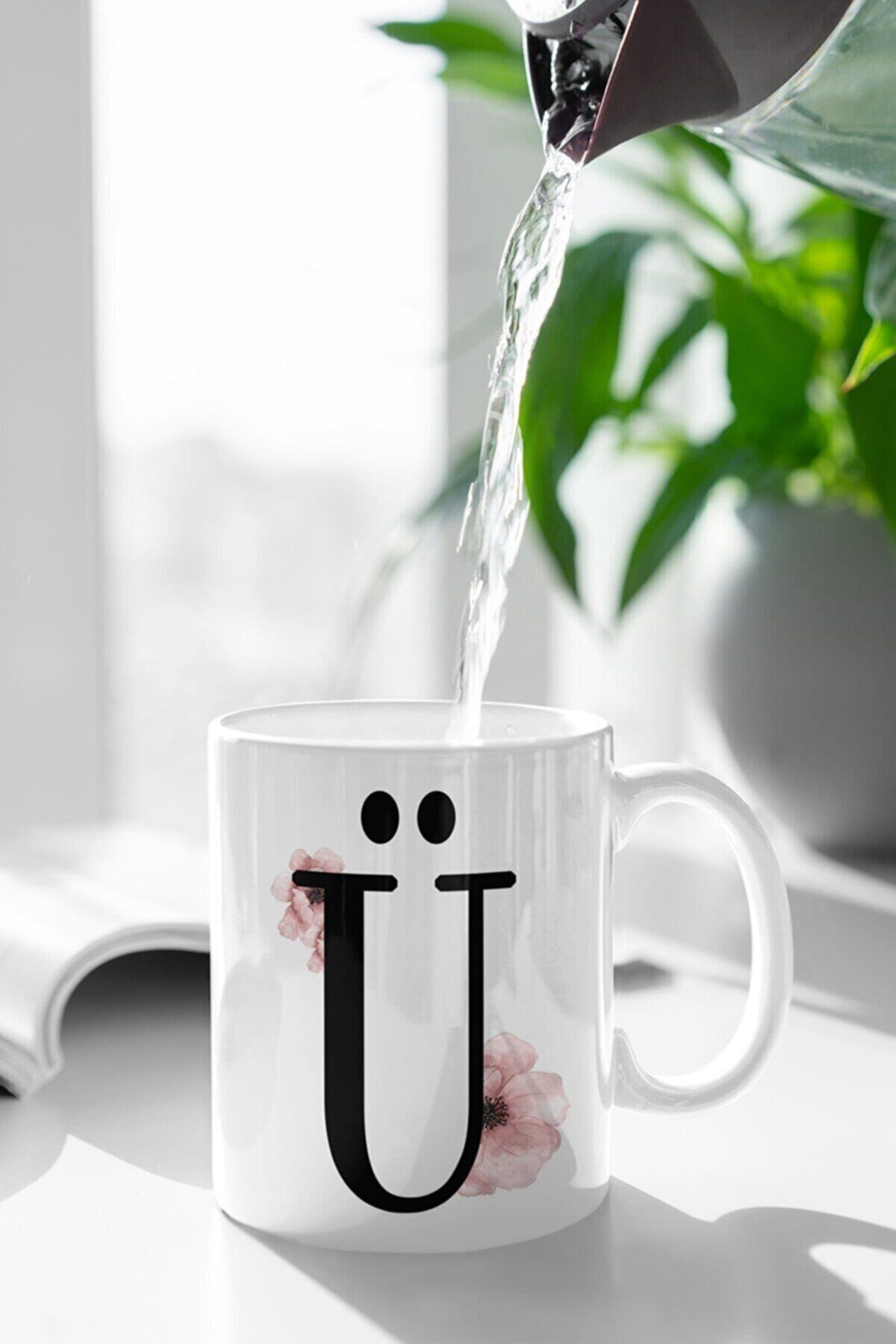 Ü Harfi Pembe Çiçek Baskılı Kupa Beyaz