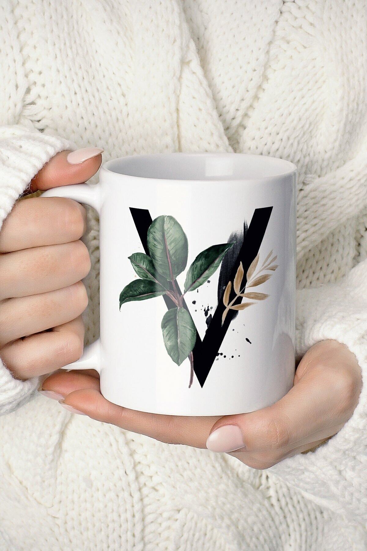 V Harf Baskılı Tropikal Koleksiyon Porselen Kupa Bardak