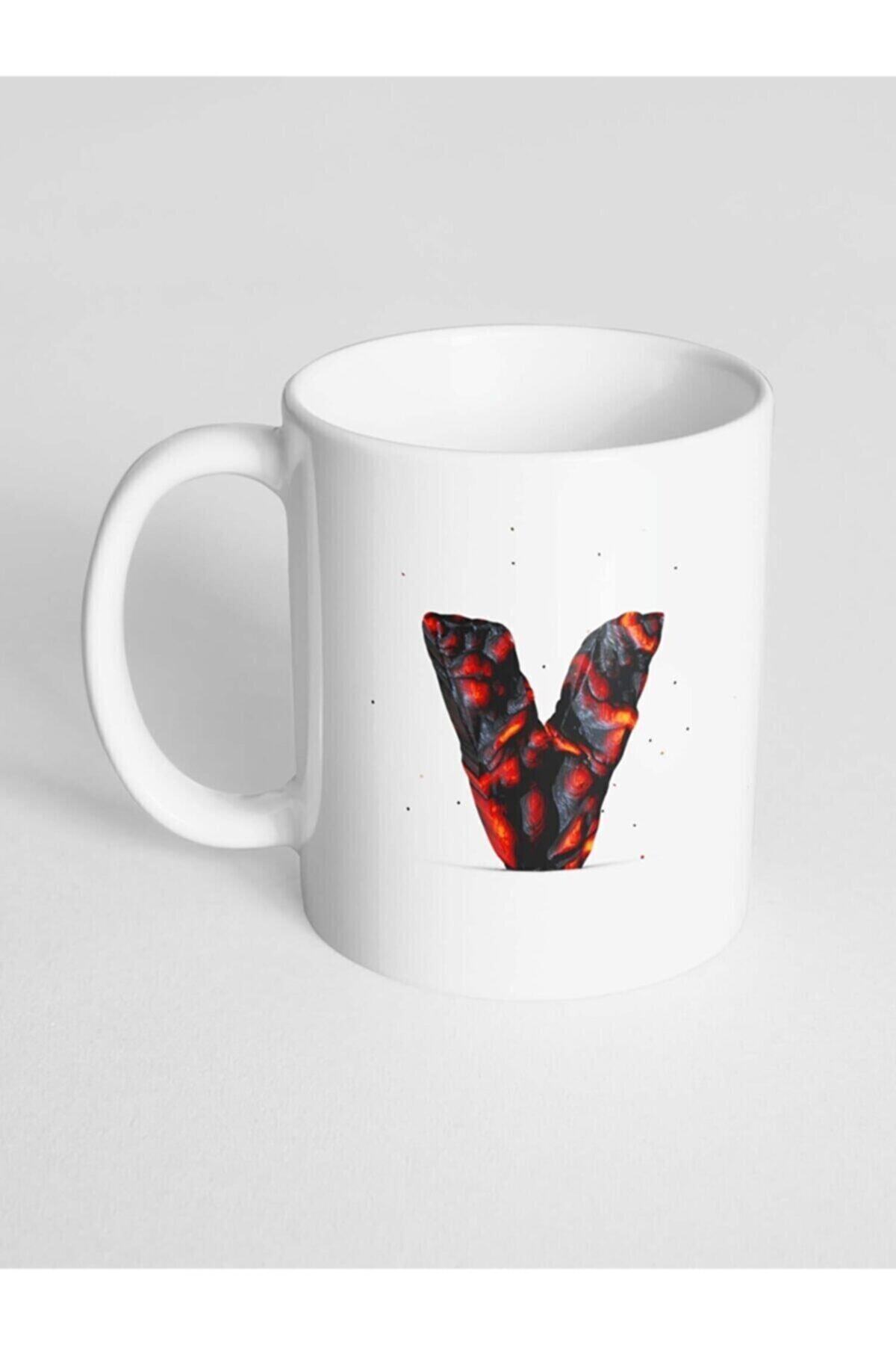 V Harfi Baskılı Kor Alevli Desenli Dekoratif – Baş Harf Baskılı Kupa Bardak