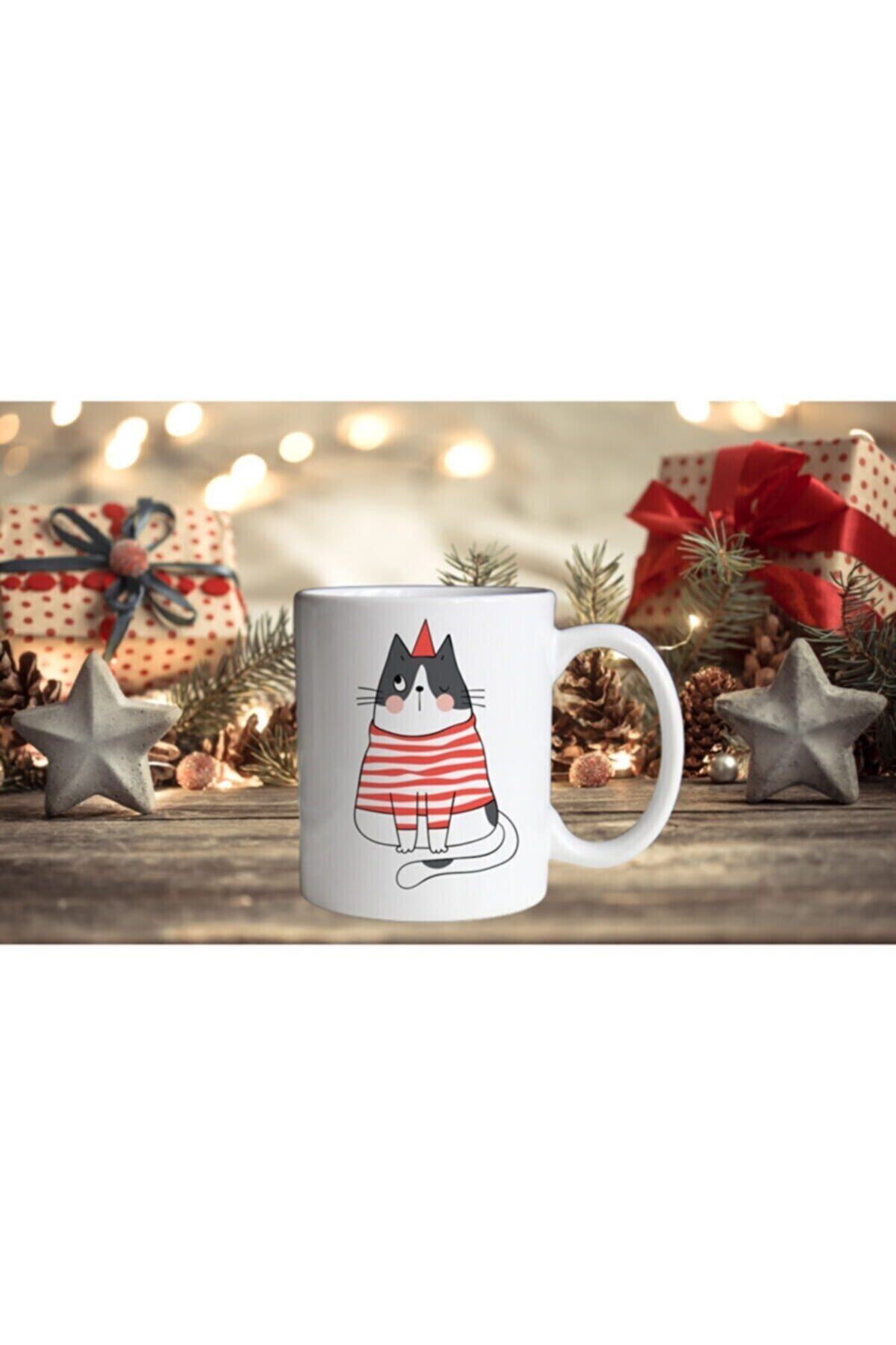Yılbaşı Özel Tasarım – Yılbaşı Kedisi Basklı Beyaz Kupa Bardak-001 Tfcr